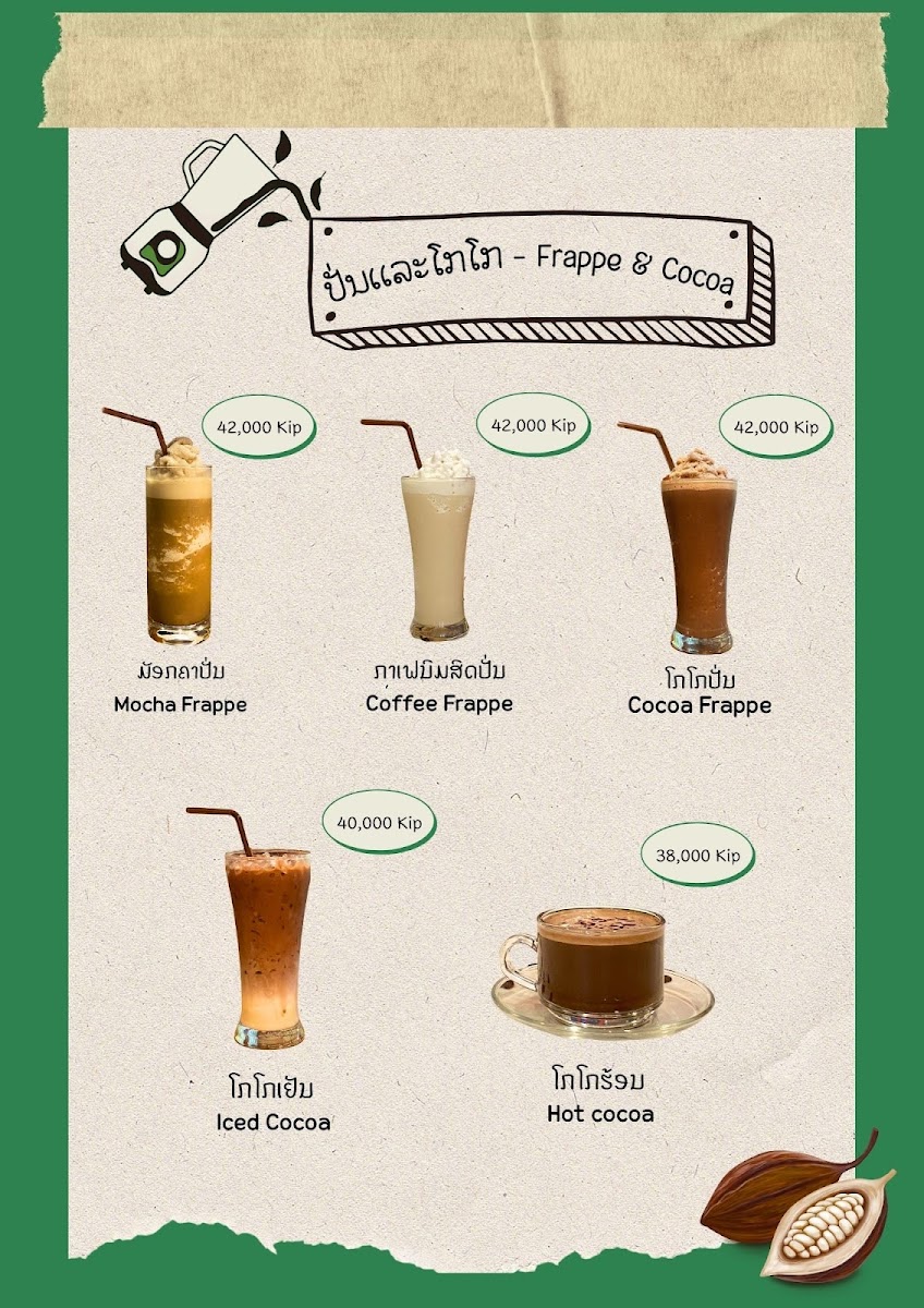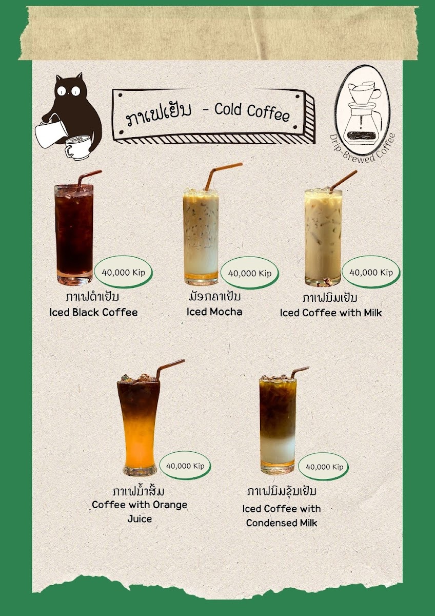The menu features a selection of real Lao coffee that has garnered praise for its rich flavor, perfect for fueling a study session or a relaxing afternoon. Alongside, you'll find an array of teas and light snacks that complement your reading experience.
